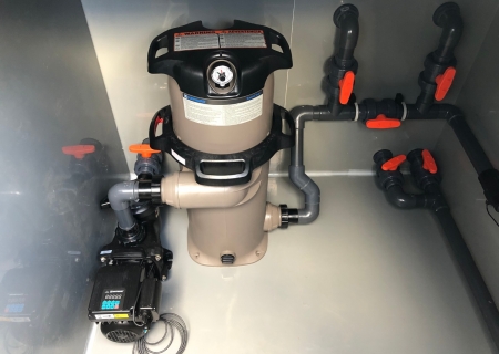 In Privatpools werden oft völlig zusammenbaute und eingesteckte Filtersysteme mit einem Kartuschenfilter eingesetzt.